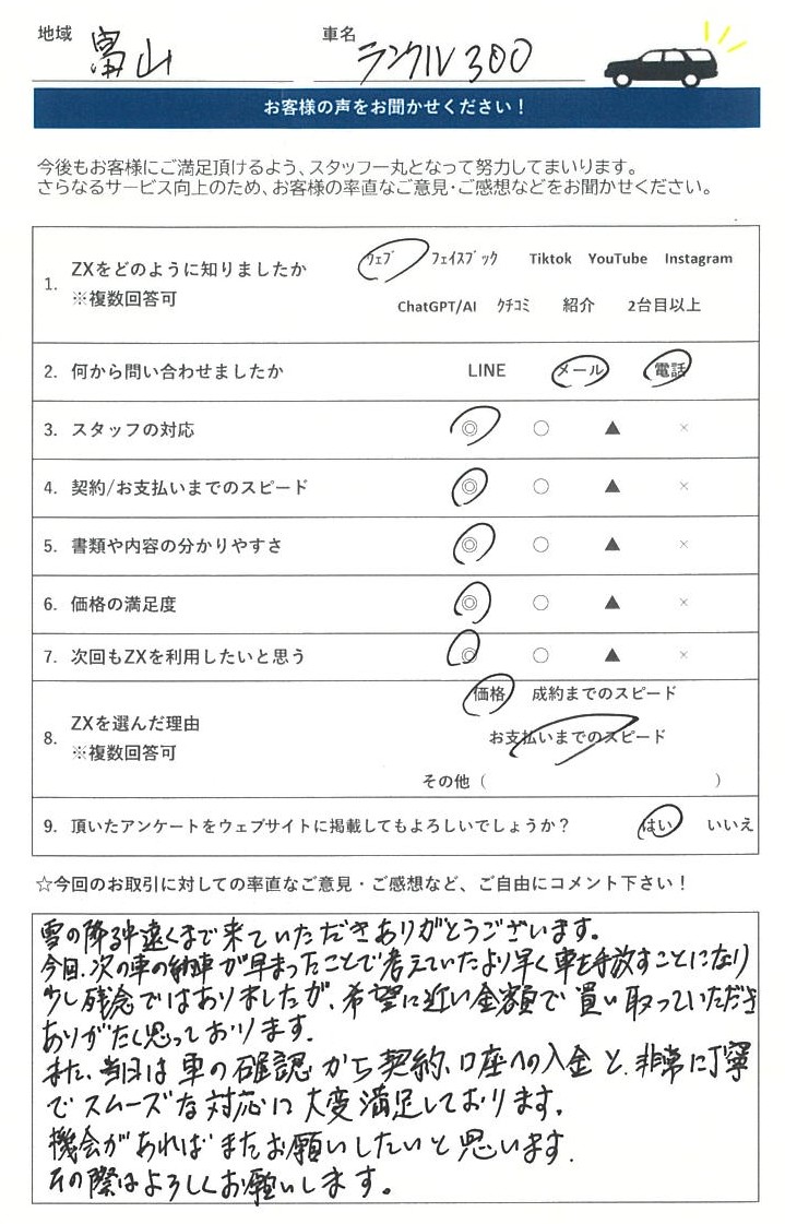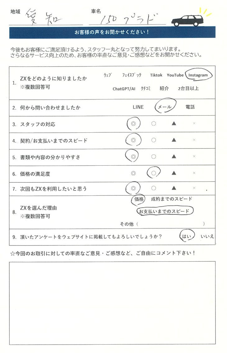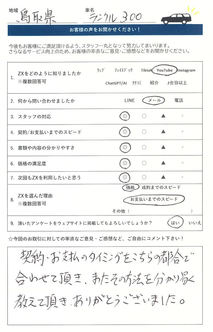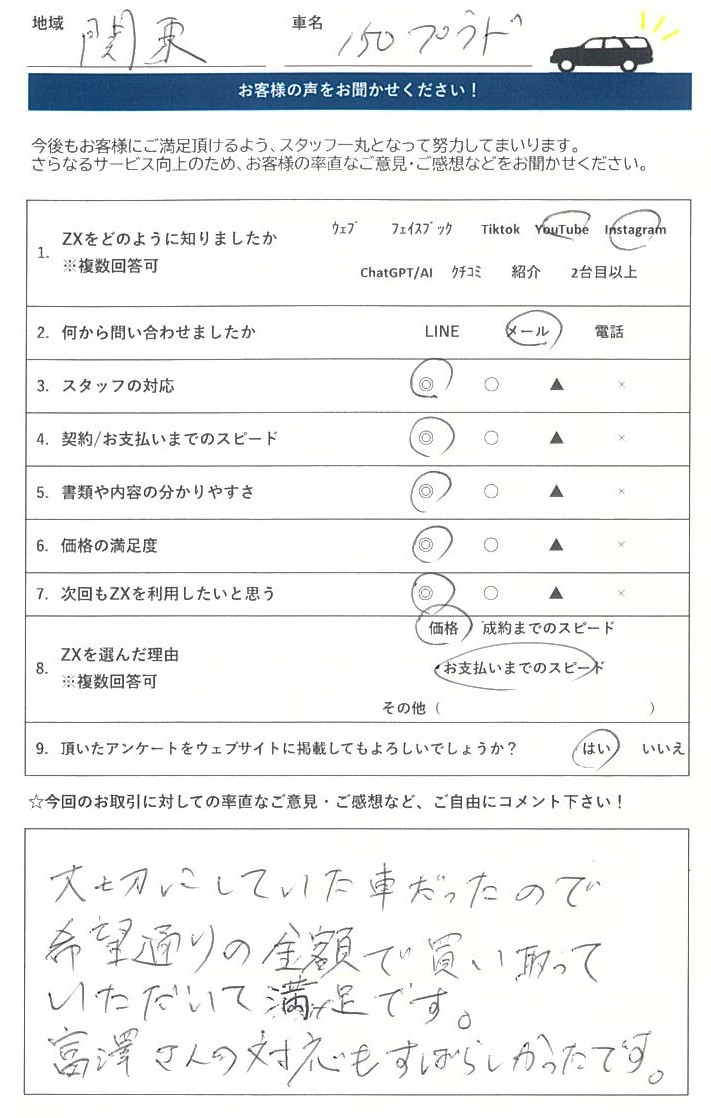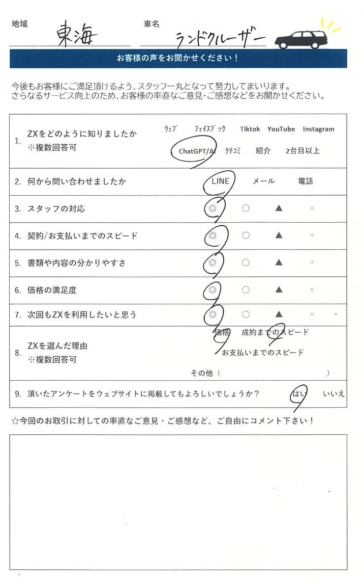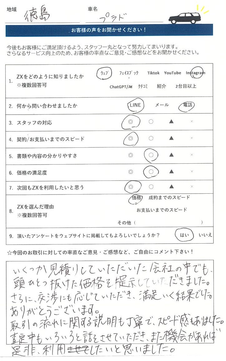 Y K 2026-02-04 いろいろと、査定をしましたが、一番高く評価していただきました。ありがとうございました。 youshi longchi 2026-02-02 専門店ということで、他社より高く買い取ってもらえました。関西在住ですが、遠方からありがとうございました。 西上愛子 2026-01-31 丁寧な対応ありがとうございました! 小田勝久 2026-01-28 大阪迄、査定に来て頂きました。 対応も良く、修理していた箇所を 当日追加で、説明し減額はあり得ると 思ってたのですが、LINEでやり取りさせて頂いた金額で買取りしてもらいました。 大満足でした。 1226 mym 2026-01-19 どこよりも高く買い取って頂けました。 対応も買取当日までメールのみでしたが不安なく売ることが出来ました。 RYOTA NAKAMA 2026-01-17 見積もりを5社程度行いましたが、最高値を提示していただき、対応もよかったので引き取りをお願いしました。次回も機会があれば是非お願いしたいと思えるほど、好印象でした。 J S 2026-01-15 ランクル70を売却 某ランクル専門店を含めた数社の査定の中でも、最高額を提示頂きました。 引渡し当日の現車確認でしたが、減額査定もなく丁寧な対応、その場で即時入金して頂いた点も満足です。 ランクル売却を検討している方はオススメです。 天神亮太 2026-01-09 県外からの買取りですが希望金額で売却して頂きとてもいい対応でした。 locohata ota 2025-12-21 tiktok広告から売却しました。 不安でしたが、高額買取だったので口コミ等調べまくって売却決めました 京都まで撮りにきていただき、即日振込、いろいろな事を教えていただき信頼できると感じました 次回もお願いしたいと思ってます t t 2025-12-15 圧倒的高価買取!対応も素晴らしい!また利用したいです。