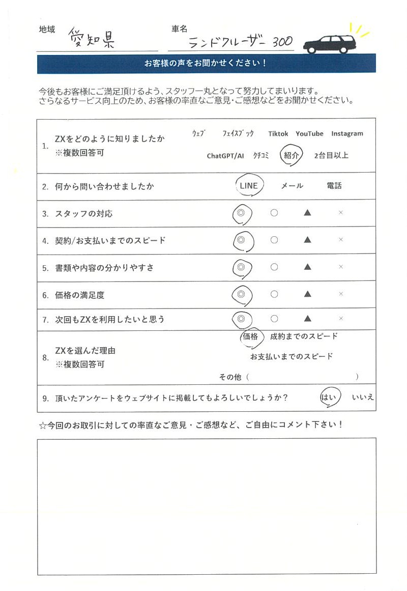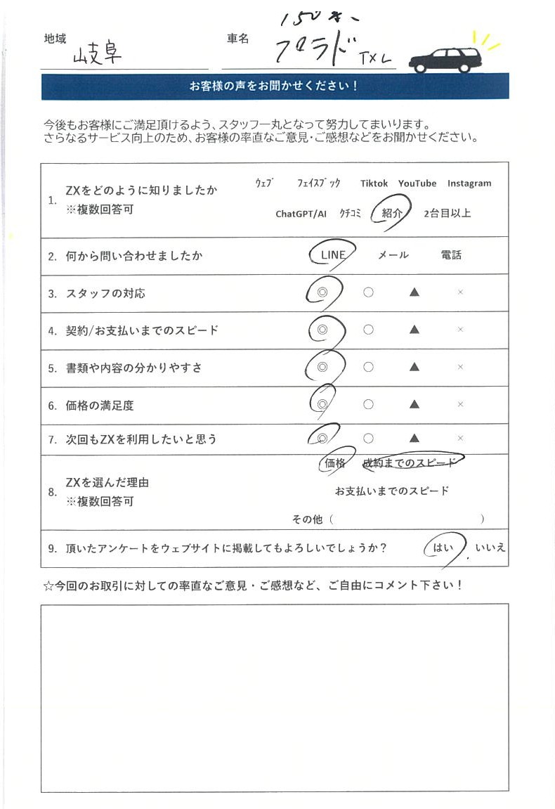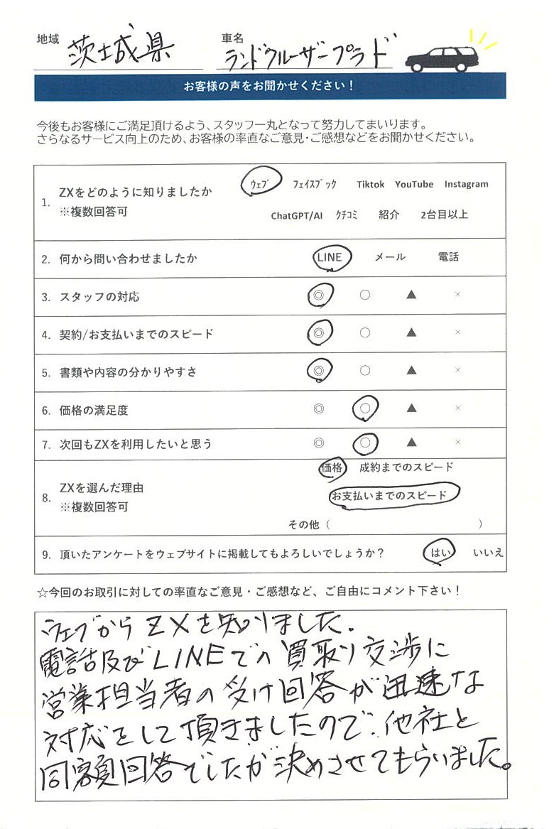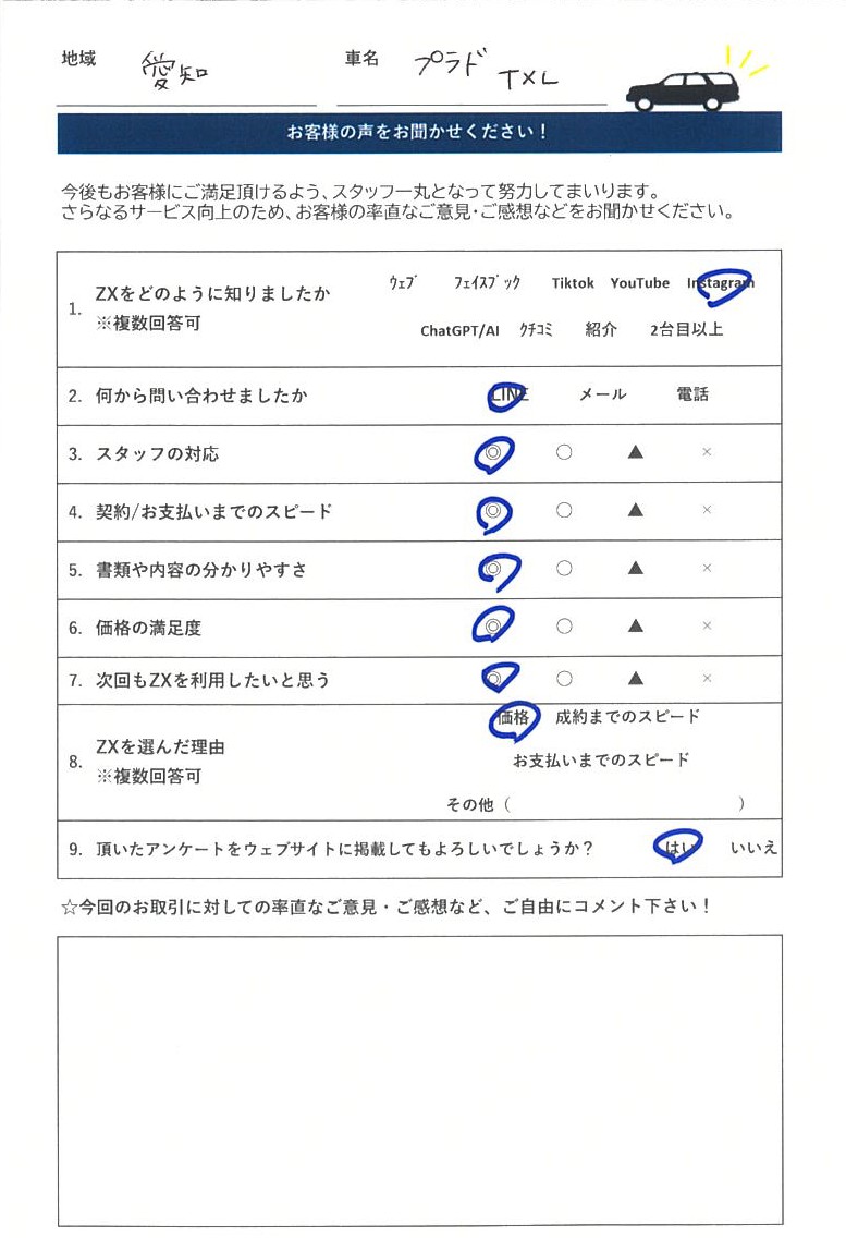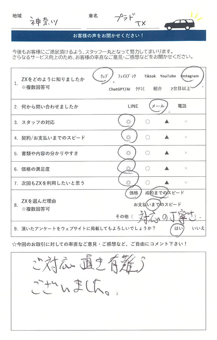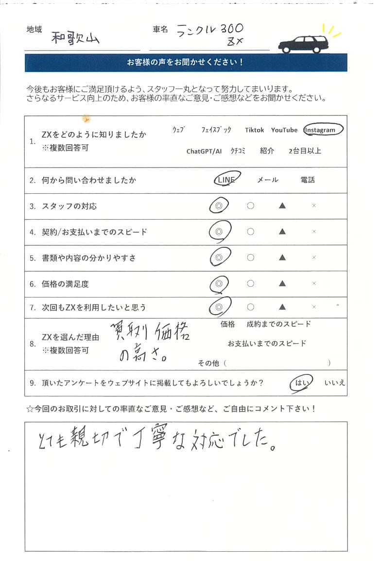 T2H 2026-03-12 車を買取していただきました! ネットや近隣のお店で5社ほど査定してもらいましたが、1番良い条件を提示していただいたので、お願いしました。 担当の富澤さんの説明や対応もスムーズで、売却金もその場で振込されました。 ランクル手放すなら、ZXさんを査定の1社に入れたほうがいいですよ!! Y K 2026-02-04 いろいろと、査定をしましたが、一番高く評価していただきました。ありがとうございました。 youshi longchi 2026-02-02 専門店ということで、他社より高く買い取ってもらえました。関西在住ですが、遠方からありがとうございました。 西上愛子 2026-01-31 丁寧な対応ありがとうございました! 小田勝久 2026-01-28 大阪迄、査定に来て頂きました。 対応も良く、修理していた箇所を 当日追加で、説明し減額はあり得ると 思ってたのですが、LINEでやり取りさせて頂いた金額で買取りしてもらいました。 大満足でした。 1226 mym 2026-01-19 どこよりも高く買い取って頂けました。 対応も買取当日までメールのみでしたが不安なく売ることが出来ました。 RYOTA NAKAMA 2026-01-17 見積もりを5社程度行いましたが、最高値を提示していただき、対応もよかったので引き取りをお願いしました。次回も機会があれば是非お願いしたいと思えるほど、好印象でした。 J S 2026-01-15 ランクル70を売却 某ランクル専門店を含めた数社の査定の中でも、最高額を提示頂きました。 引渡し当日の現車確認でしたが、減額査定もなく丁寧な対応、その場で即時入金して頂いた点も満足です。 ランクル売却を検討している方はオススメです。 天神亮太 2026-01-09 県外からの買取りですが希望金額で売却して頂きとてもいい対応でした。 locohata ota 2025-12-21 tiktok広告から売却しました。 不安でしたが、高額買取だったので口コミ等調べまくって売却決めました 京都まで撮りにきていただき、即日振込、いろいろな事を教えていただき信頼できると感じました 次回もお願いしたいと思ってます